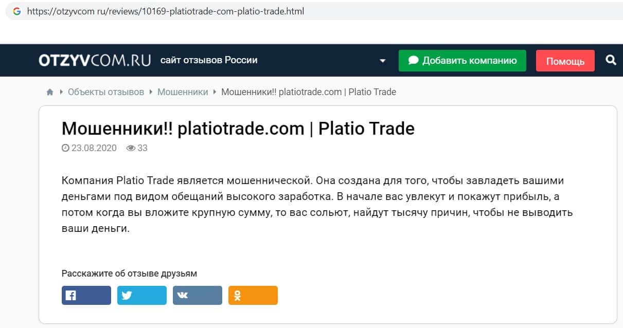 На интернет ресурсе otzyvcom ru мы нашли информацию о том, что компания кидал Платио Трейд мошенники, которые просто собирают деньги обещая клиентам большую прибыль.