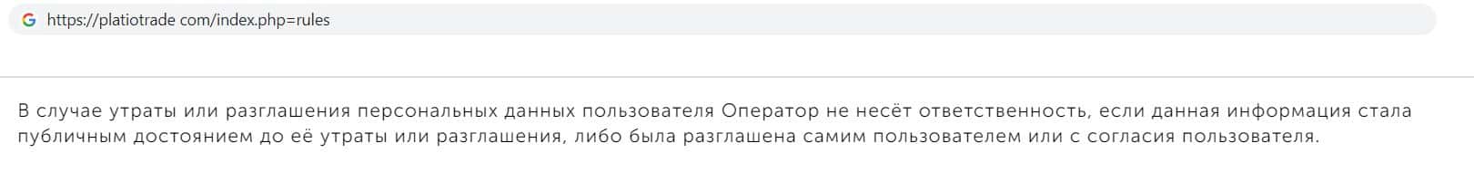 А вот в данном пункте компания лохотронщиков PlatioTrade указала, что при потерне или разглашение данных клиента, компания не несёт никакой ответственности за это.