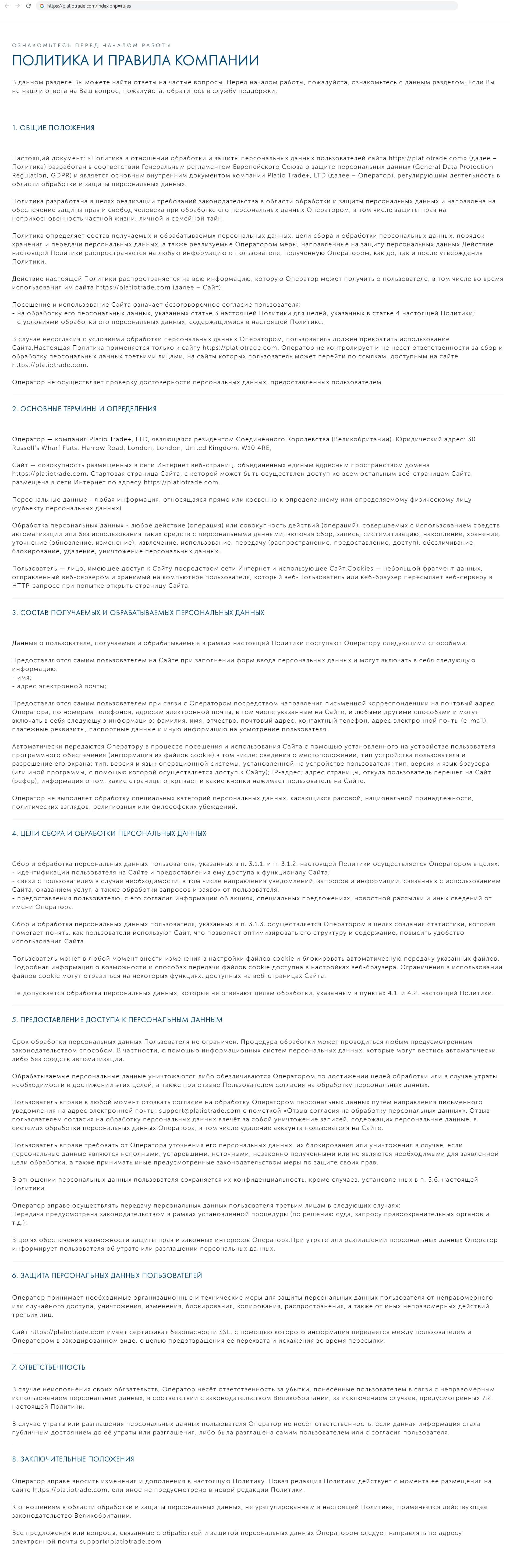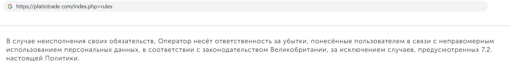 Так же фирма кидал PlatioTrade указала, что несёт ответственность за убытки, но подчиняясь законам Великобритании. которые не распространяются на жителей стран СНГ.