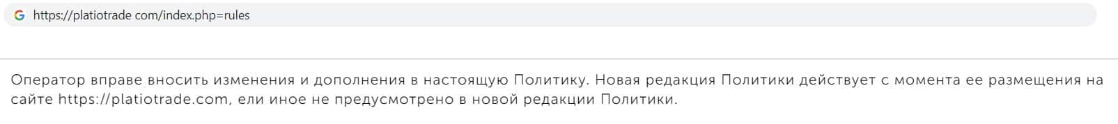 И конечно же разводилы PlatioTrade указали, что имеют право в любой момент вносить изменения в свой договор, которые вступают в силу с момента публикации. Но согласие клиентов никто не учитывает.