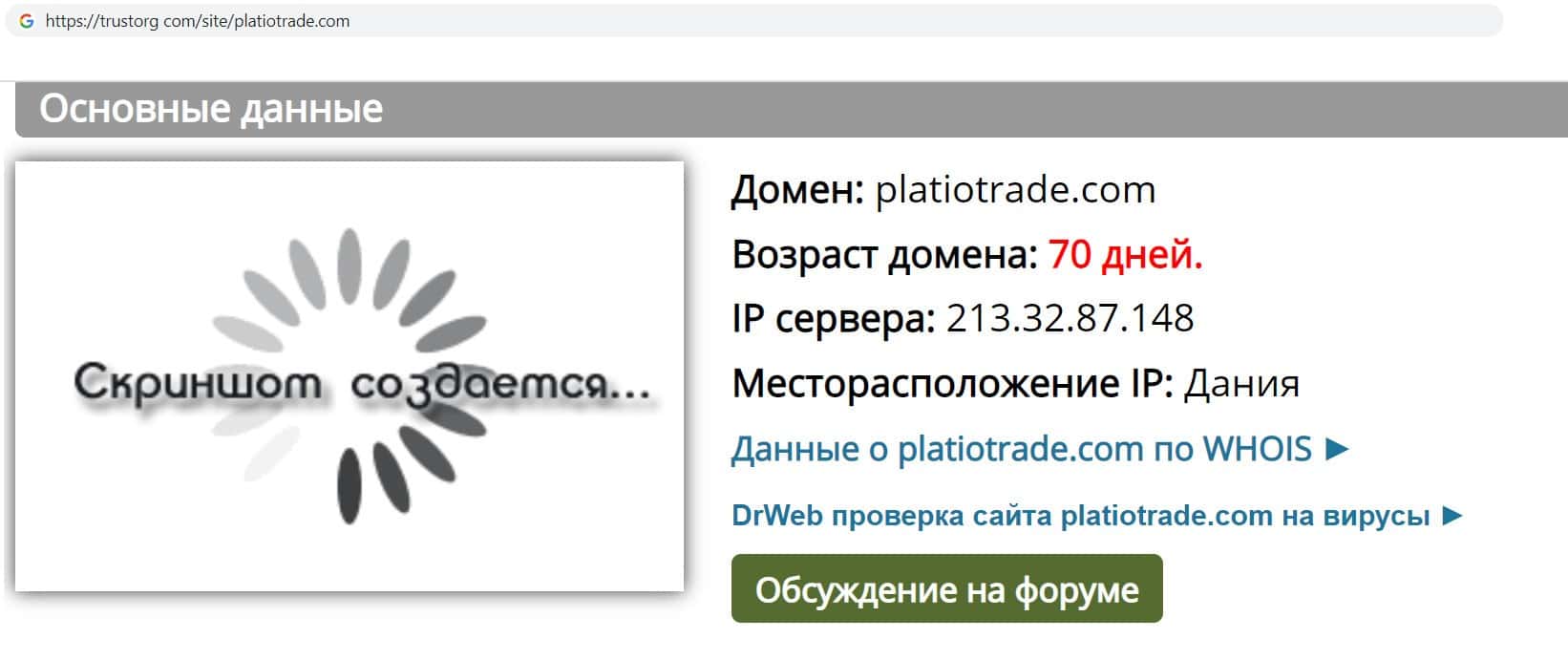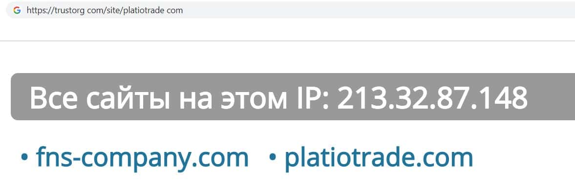 Мы проверили компанию мошенников с помощью сайта trustorg com, и оказалось. что на одном айпи с аферистами Платио Трейд был ещё один лохотрон, который уже слился.Возраст компании финансовых разводил Платио Трейд