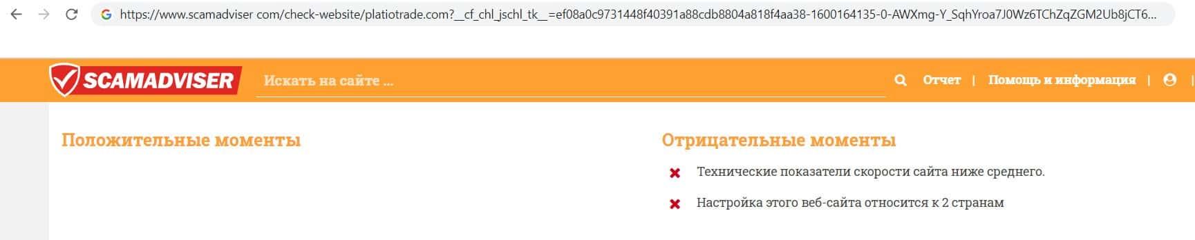 Мы проверили сайт мошенников PlatioTrade через интернет ресурс scamadviser com. Сайт отметил, что техначеские показатель скорости сайта очень низкие, а так же настройки сайта относятся к двум странам.