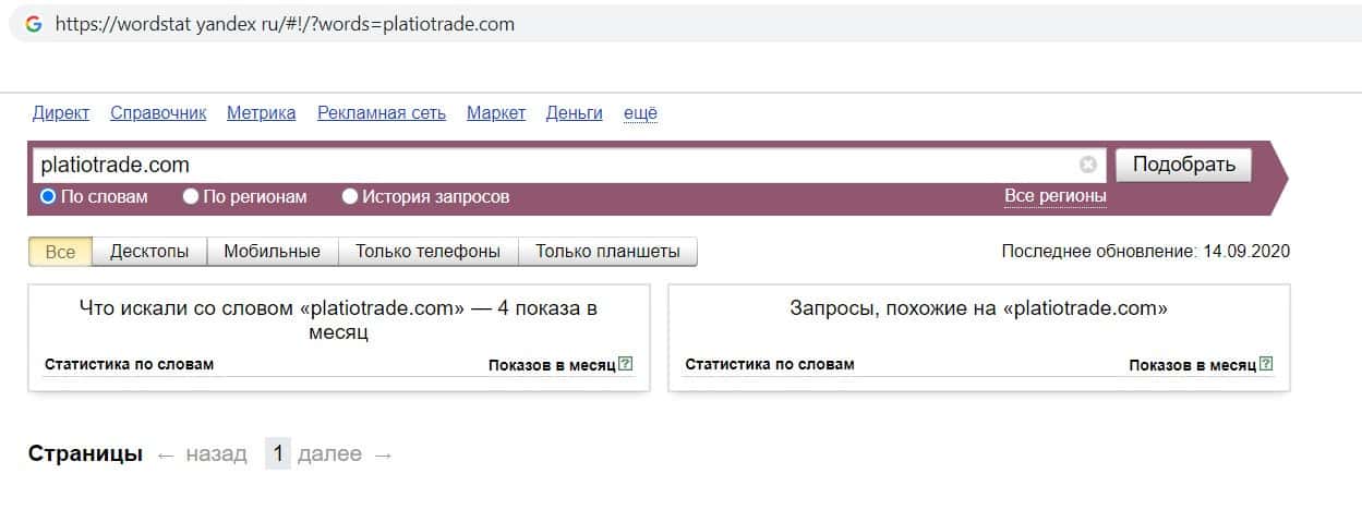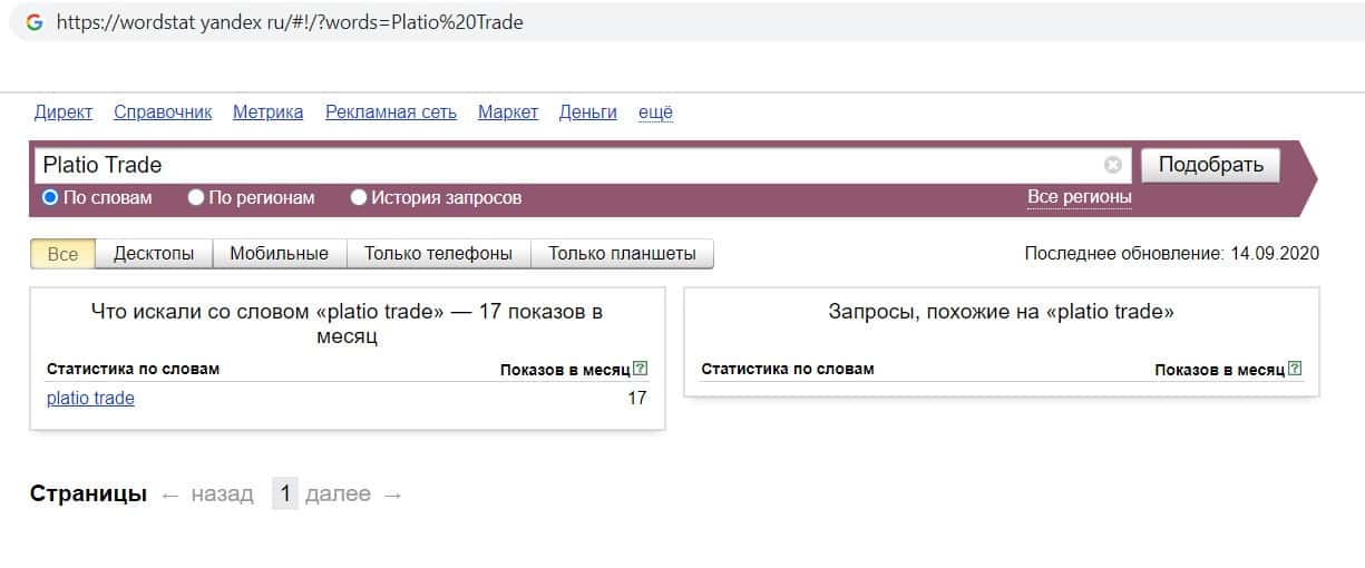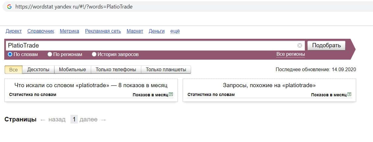 Мы проверили количество запросов компании PlatioTrade в Яндексе по названию фирмы. а именно "PlatioTrade". 8 раз пользователи выполняли данный запрос в течении месяца.