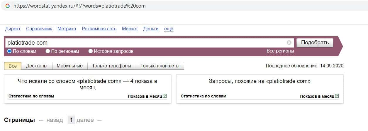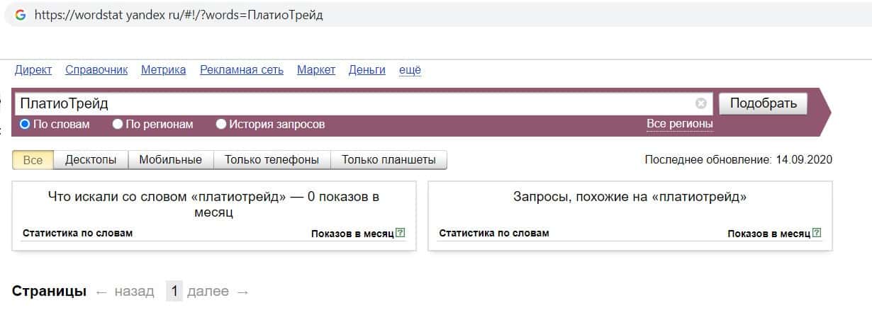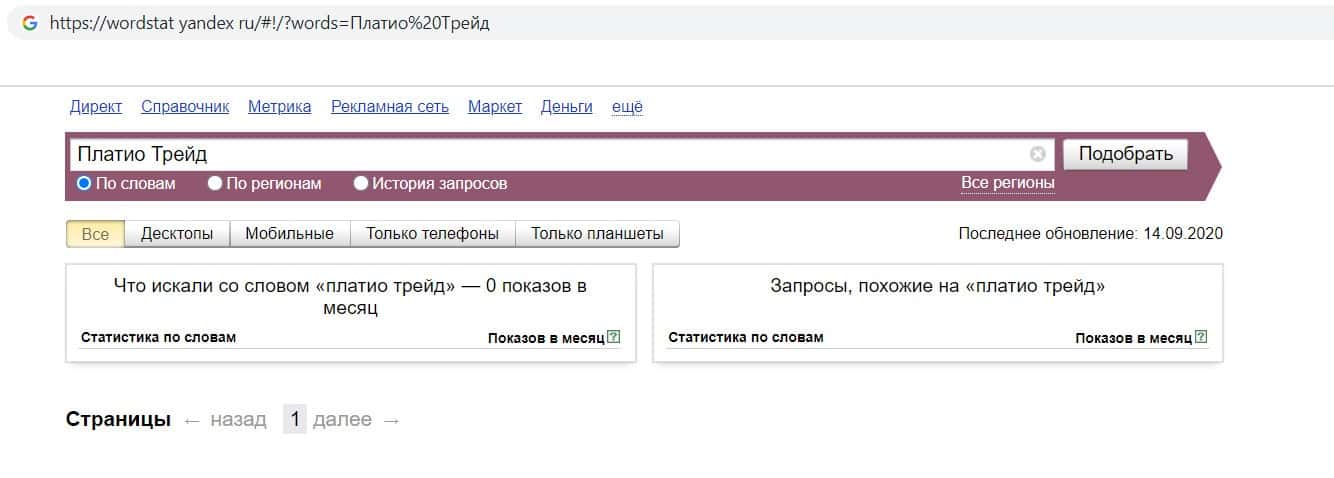 Мы так же проверили и количество запросов компании разводил PlatioTrade по русскоязычному названию, а именно "Платио Трейд". Но и тут результат нулевой.