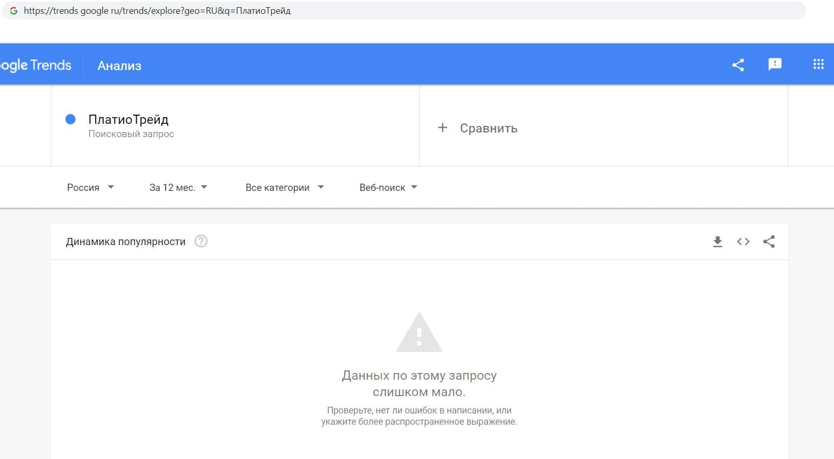 Мы проверили количество запросов компании мошенников PlatioTrade в Google по названию фирмы, а именно "PlatioTrade". Но никто не выполнял данный запрос в течении года.