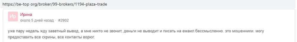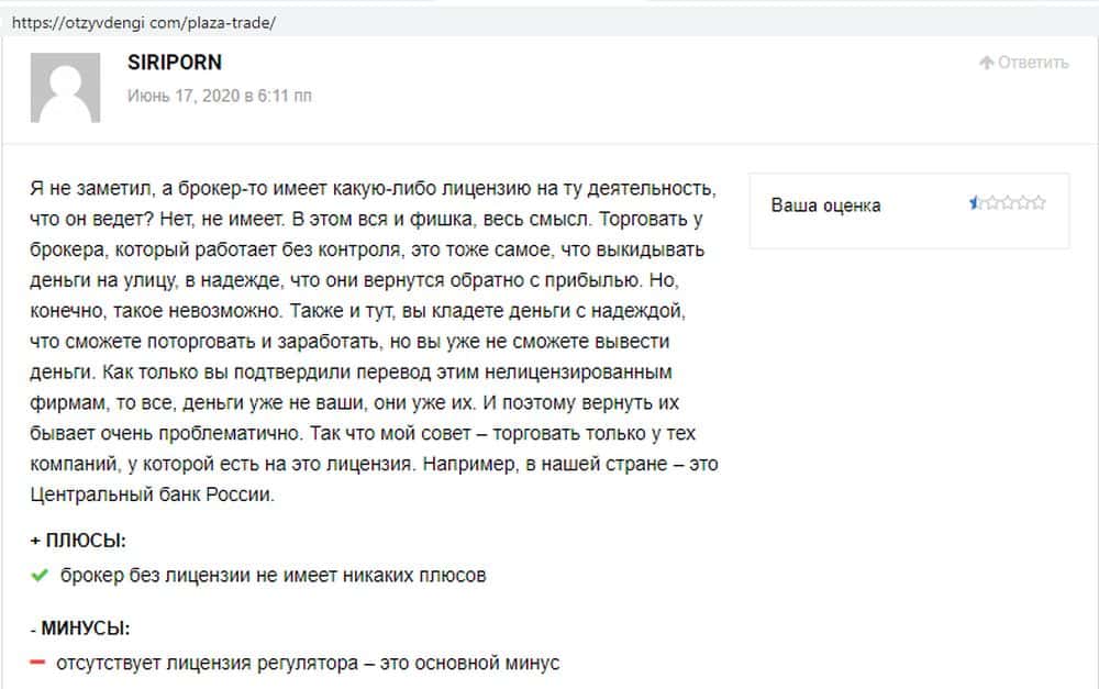 Специализированные ресурсы предупреждают своих пользователей не иметь никаких дел с шарагой Плаза Трейд, которая даже не имеет лицензии. Деньги забрать у кидал будет сложно.
