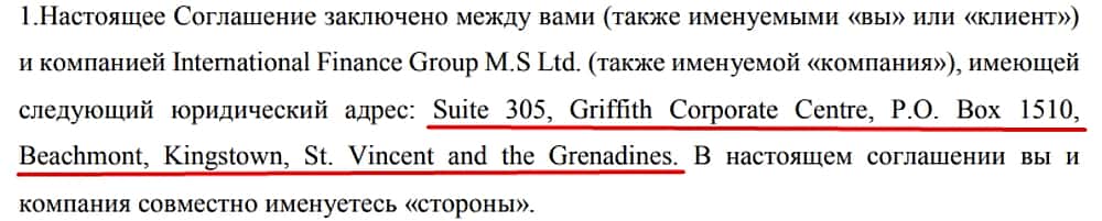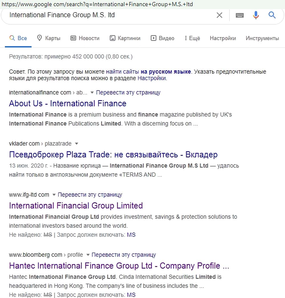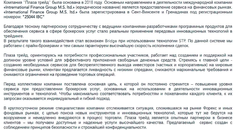 Юридическое лицо мошенники Плаза Трейд указали, вот только кроме их гнилого лжесайта, нигде более в сети не упоминается подобная конторка: International Finance Group M.S. ltd.