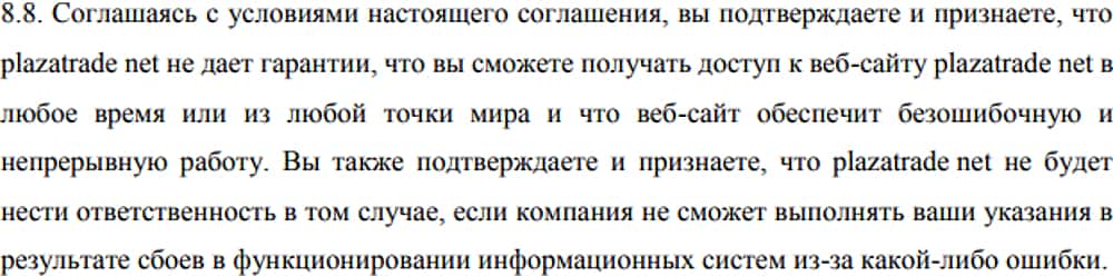 В любой момент вся шарашка Плаза Трейд может накрыться медным тазом и перестать предоставлять заявленные услуги. Об этом сами мошенники написали в своем антидоговоре.