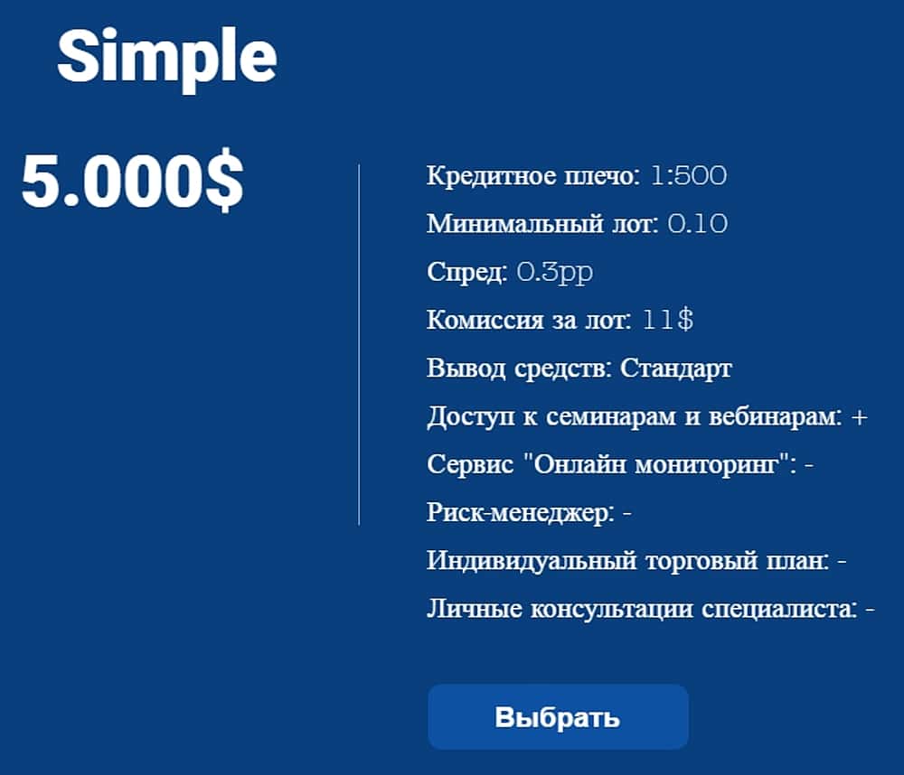 Счет Simple мало чем отличается от предыдущего, поскольку разница только в наличии доступа к неким сомнительным обучающим вебинарам и комиссии с разницей в 1 доллар.