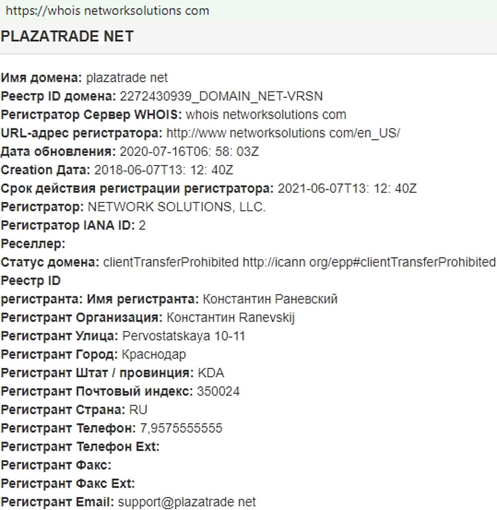 Как оказалось, домен якобы международной конторы оформлен на подставное лицо из России. Это еще один повод усомниться в том, что Плаза Трейд - реальная брокерская фирма.