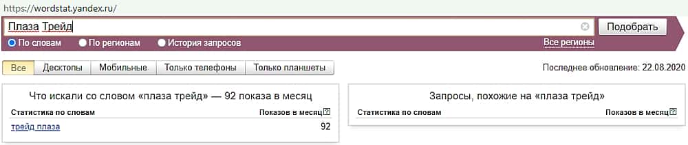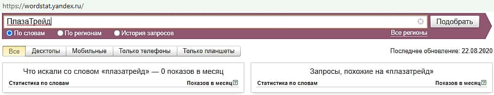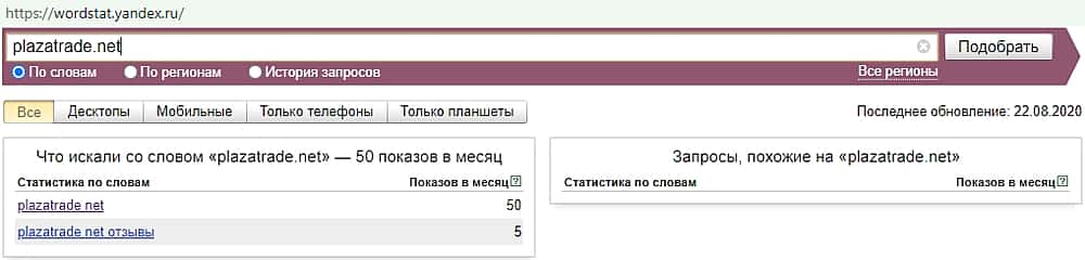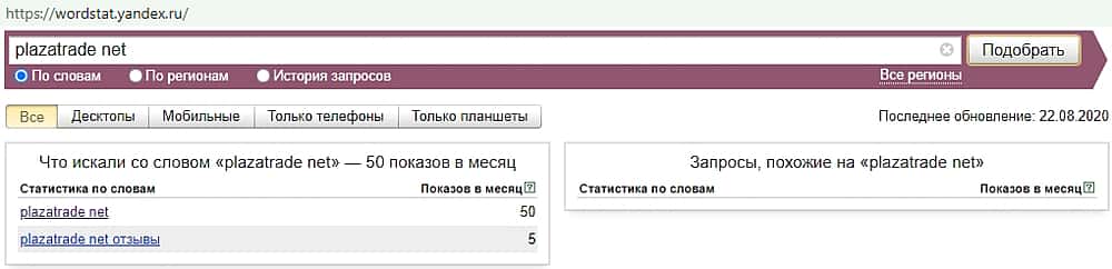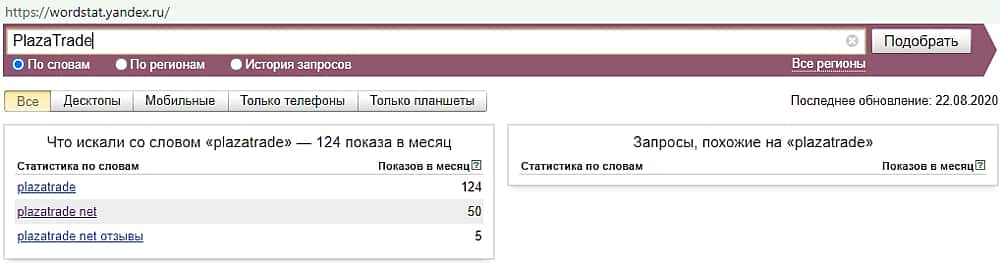 А вот по запросу "PlazaTrade" видим более реальную картину. 124 показа, причем люди искали отзывы. Надеемся, им хватило проницательности, чтобы избежать ловушки разводил.