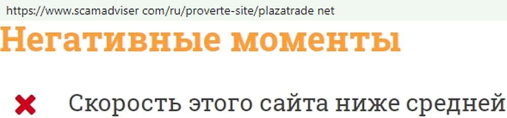 Сервис скамадвизер выявил, что скорость сайта катал Плаза Трейд предельно низкая. Подобный недостаток может использоваться для задержек котировок и слива счета трейдера.