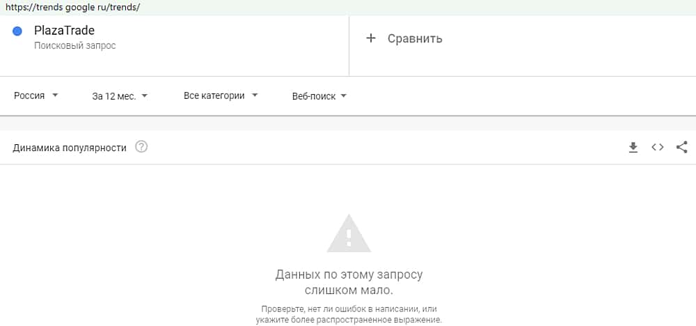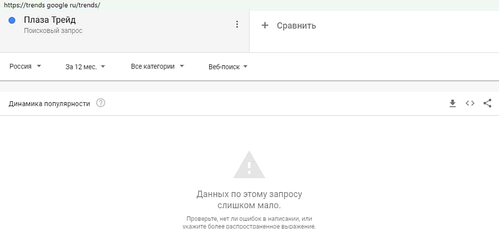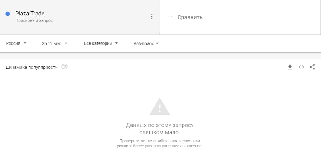 Настоящую ситуацию можно увидеть, если проанализировать популярность домена мошенников Плаза Трейд. По запросу "plazatrade net" получим нулевой результат за целый год.
