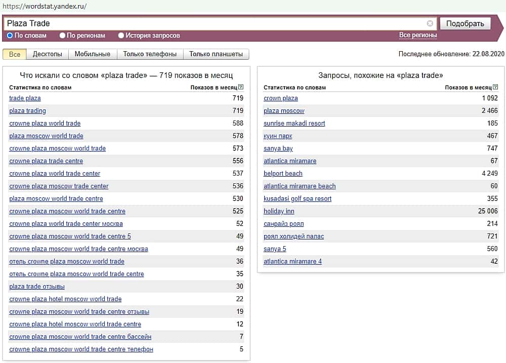 По запросу "Plaza Trade" видим 719 показов. Но жулики PlazaTrade могут не обольщаться - не по их тушки эти запросы, просто название похоже на другие, более адекватные, компании.