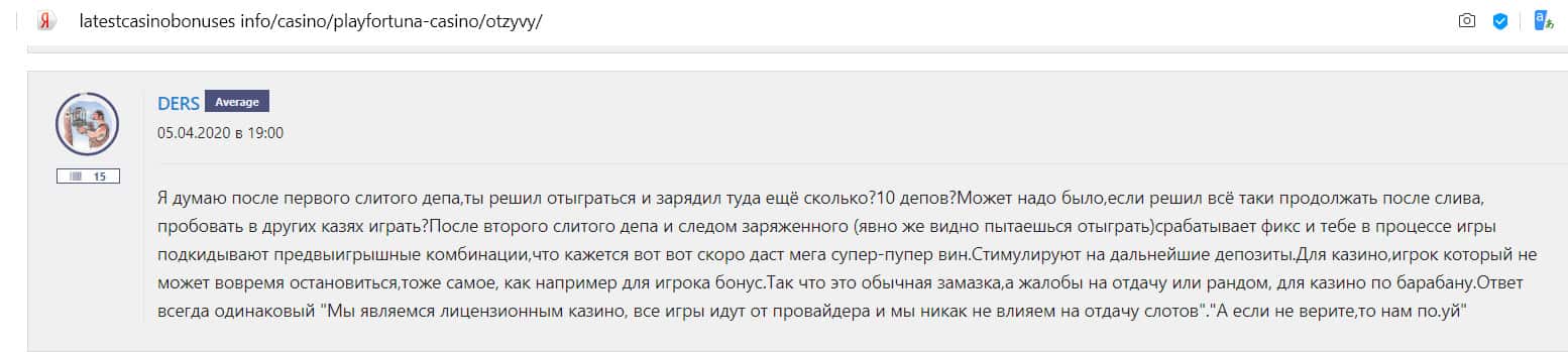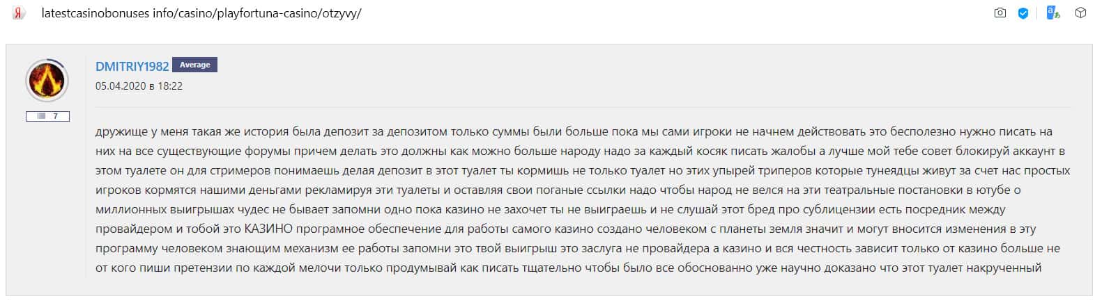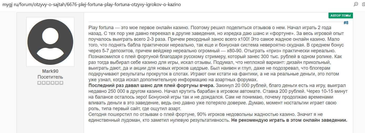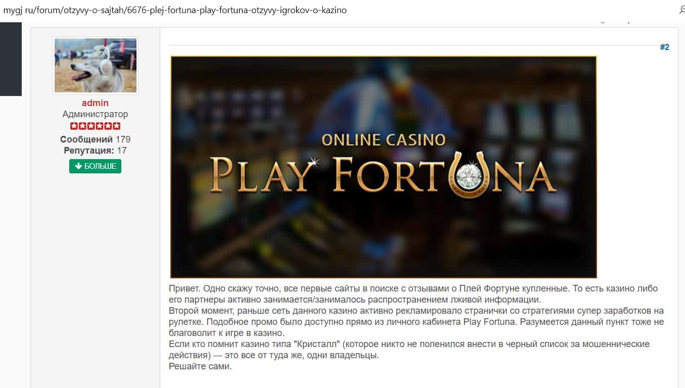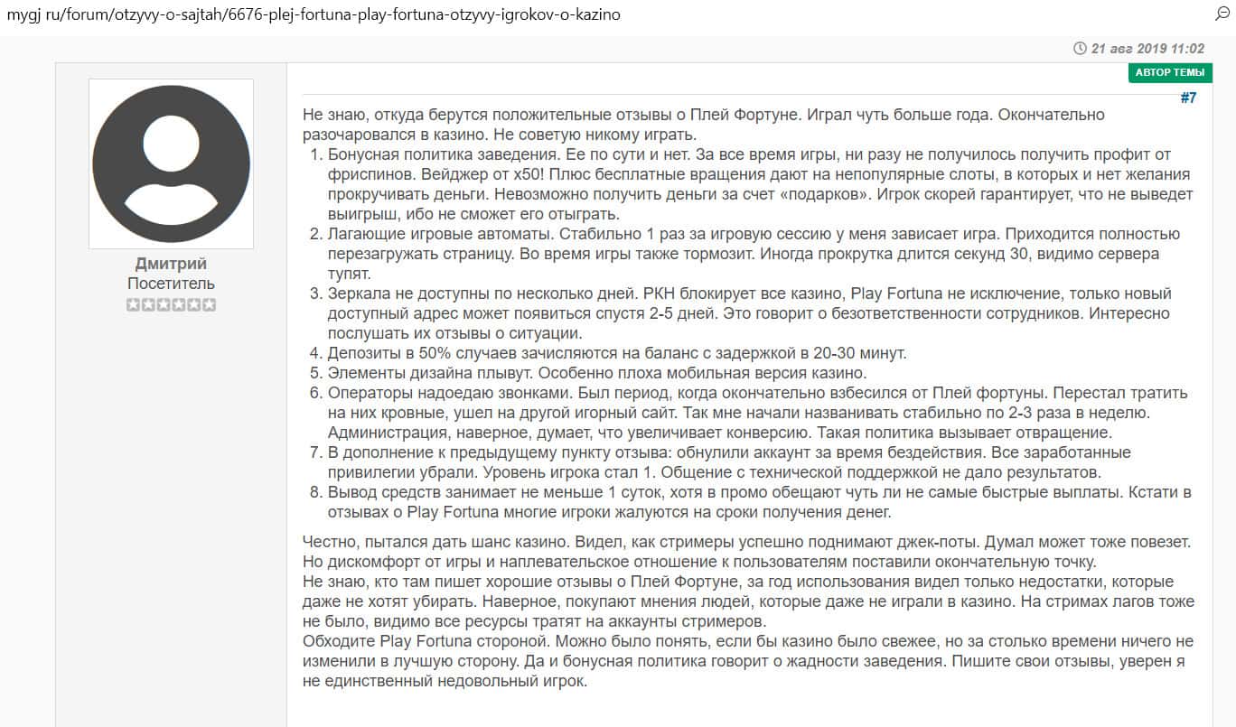 Мнение на форуме о казино Плэй Фортуна: все первые сайты в поиске с отзывами о нем купленные. Казино активно занимается распространением лживой информации.