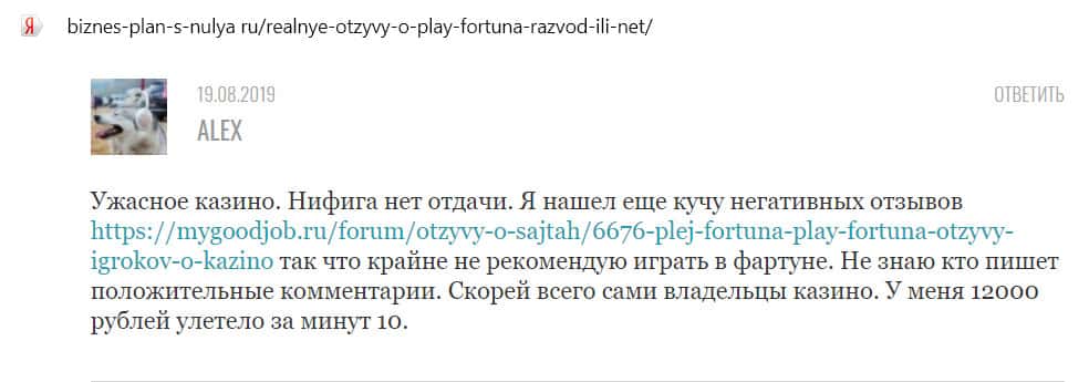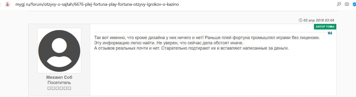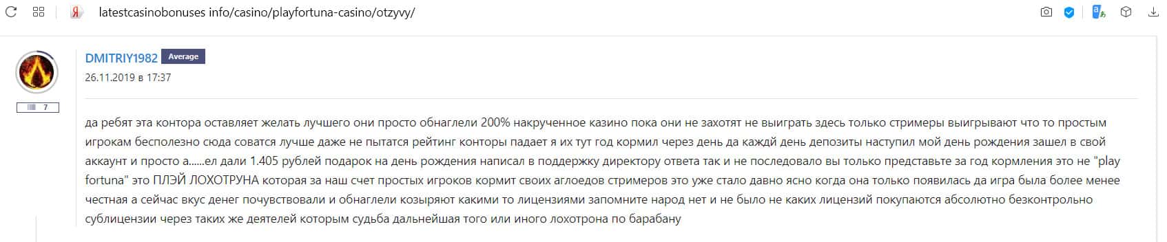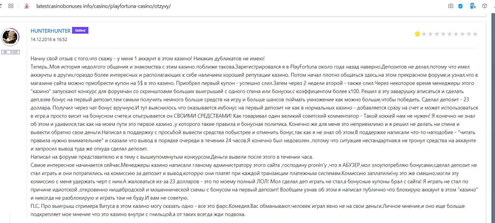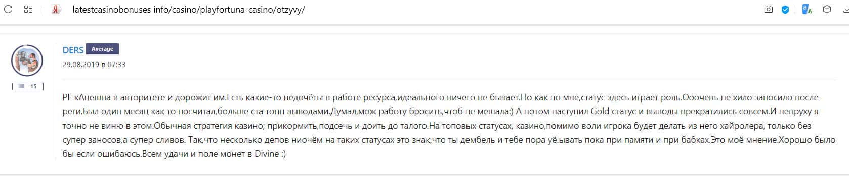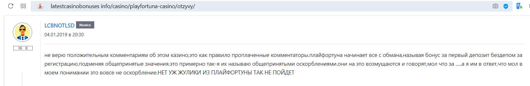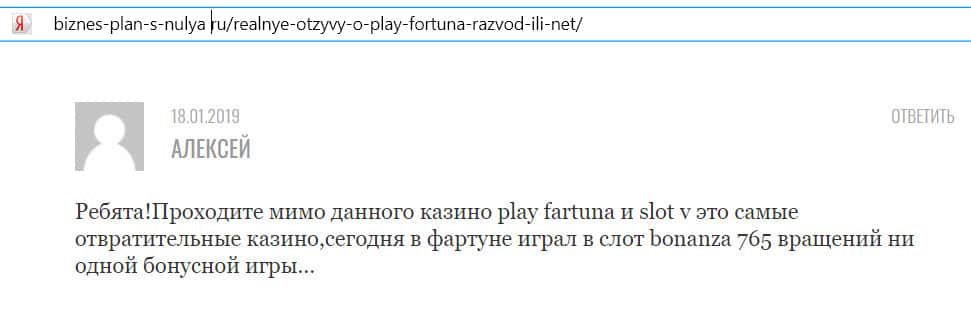 Мнение на форуме о казино Плэй Фортуна: все первые сайты в поиске с отзывами о нем купленные. Казино активно занимается распространением лживой информации.