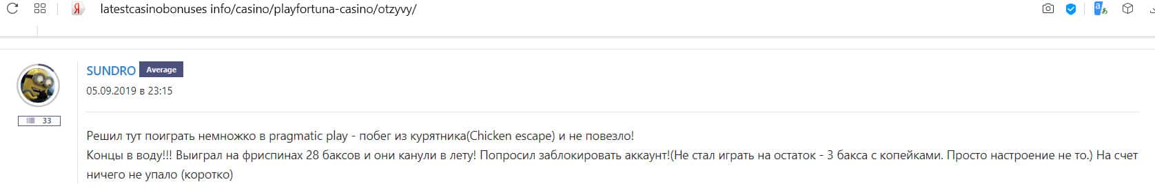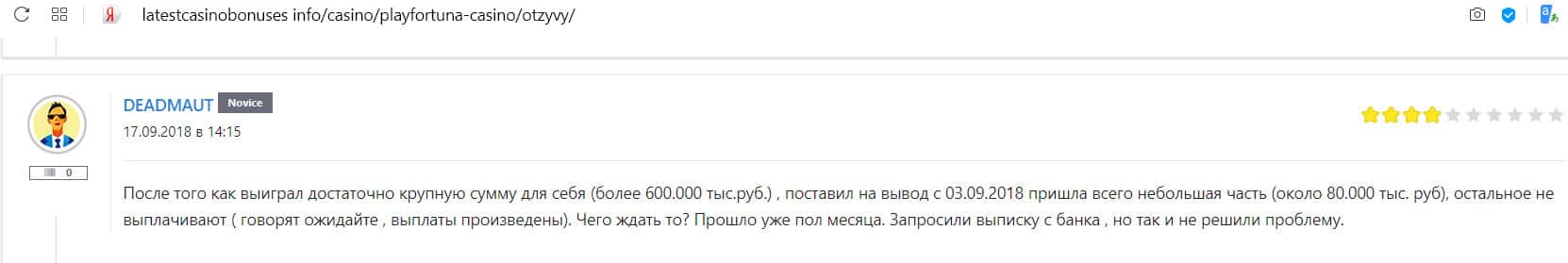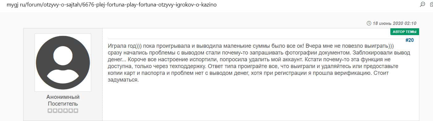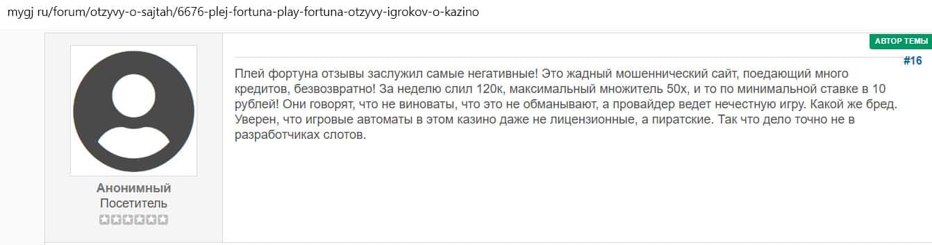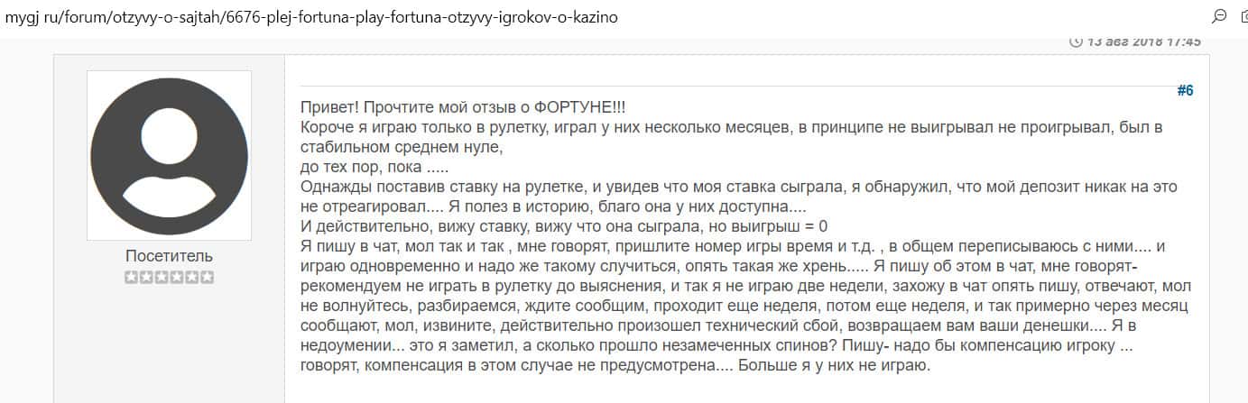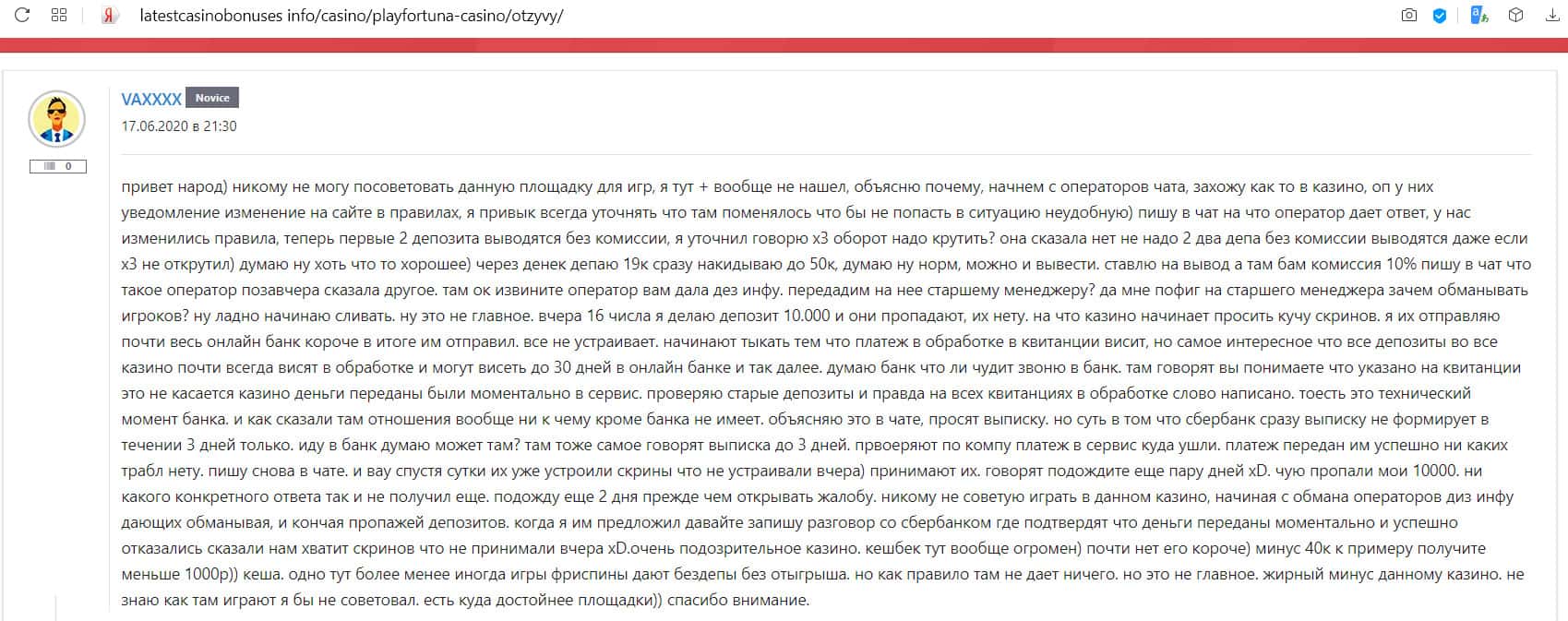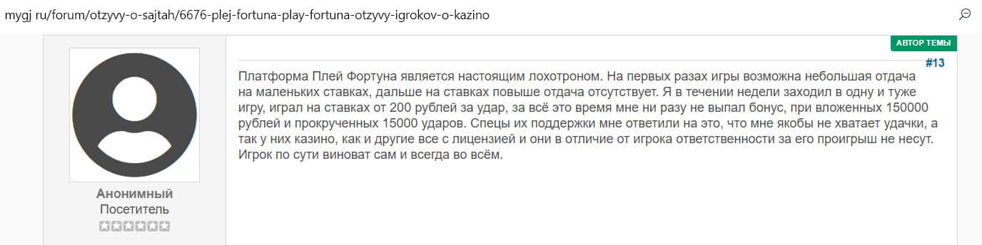 Мнение на форуме о казино Плэй Фортуна: все первые сайты в поиске с отзывами о нем купленные. Казино активно занимается распространением лживой информации.
