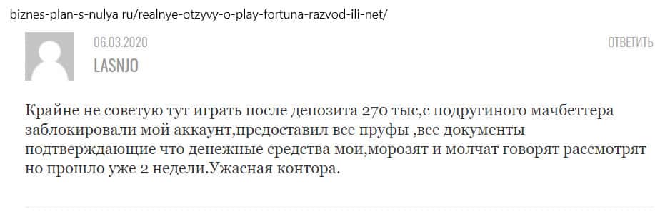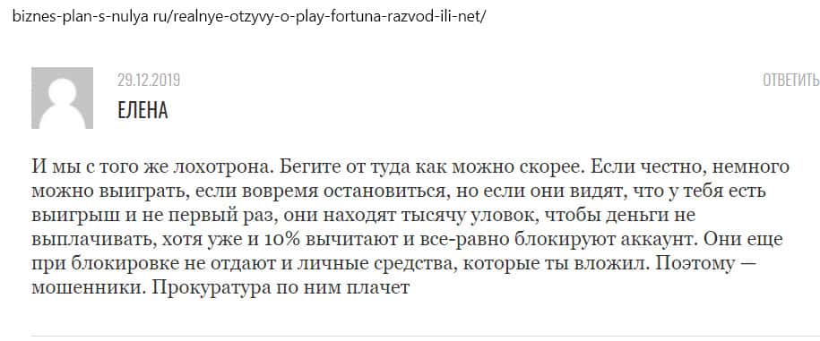 Статья на сайте biznes-plan-s-nulya ru полностью разоблачает контору Плэй Фортуна, которая не выплачивает игрокам их выигрыши. Автор статьи приводит доказательства.