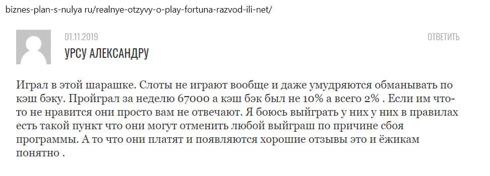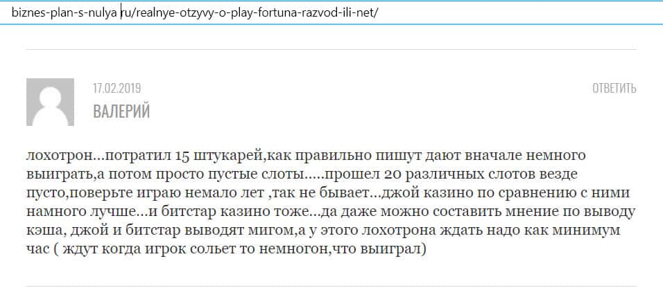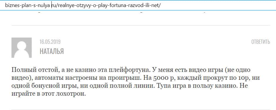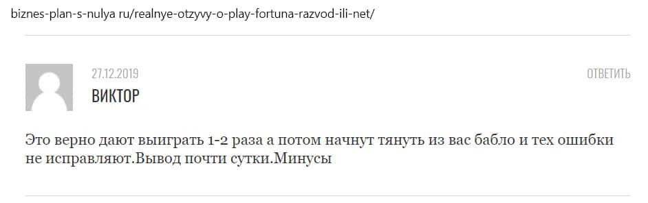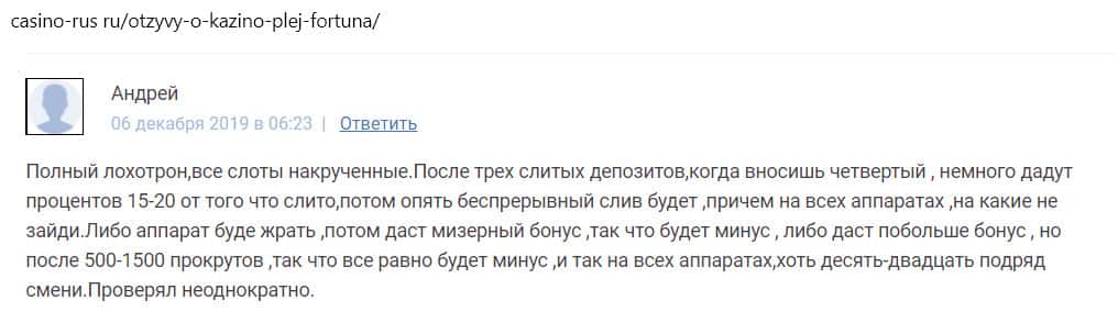 Очередной игрок пишет, что платформа Плей Фортуна является настоящим лохотроном. На первых разах игры возможна небольшая отдача, а потом она просто отсутствует.
