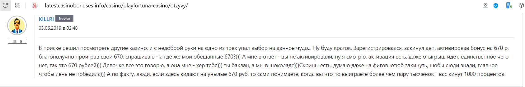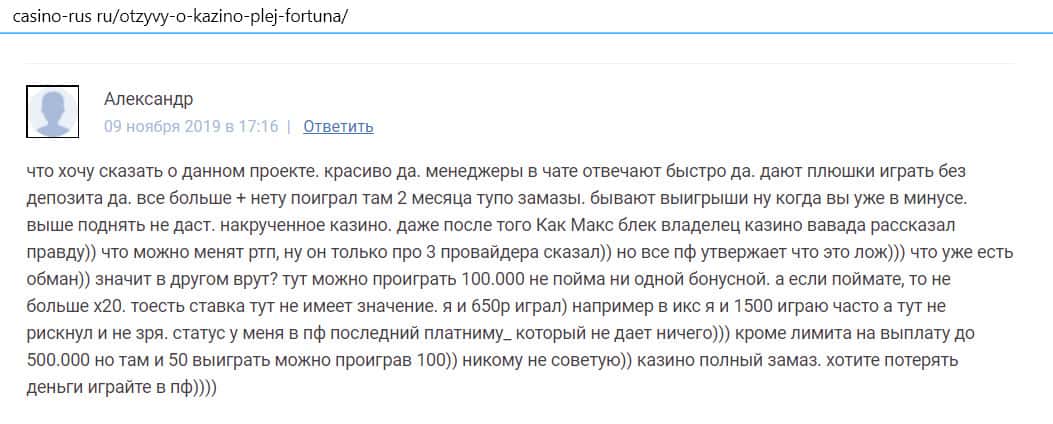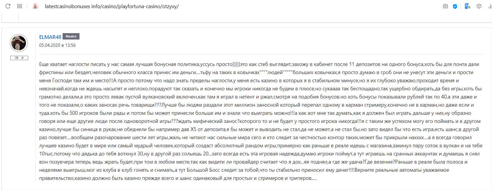 Мужчина оставил отзыв, что после 11 заведенных депозитов у него не было ни одного бонуса. Хотя Плэй Фортуна утверждает, что у них самая лучшая бонусная политика.