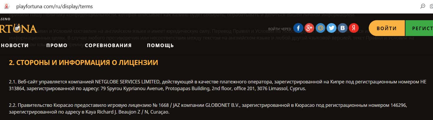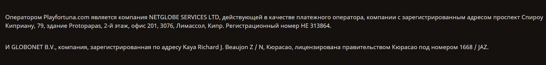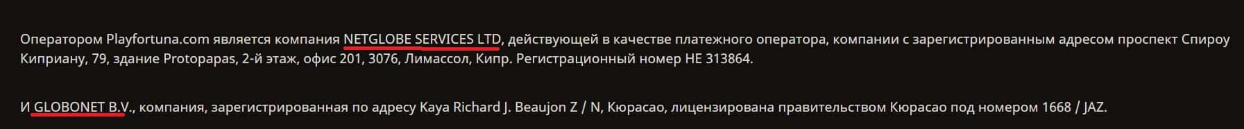 От лица казино PlayFortuna действует управляющая компания GLOBONET B.V., а также платежный агент NETGLOBE SERVICES LTD.