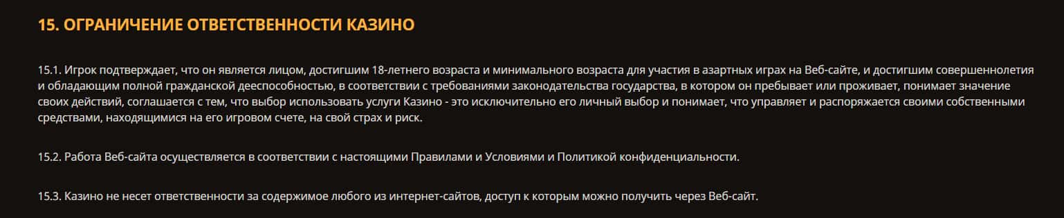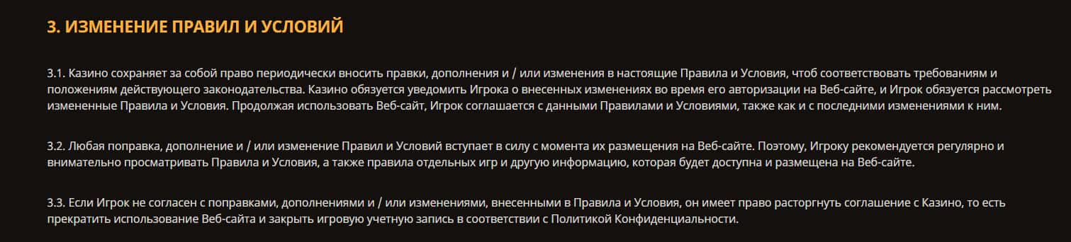 В пункте 3 оговаривается право казино изменять и дополнять настоящее соглашение на свое усмотрение. Пользователь должен сам следить за поправками.
