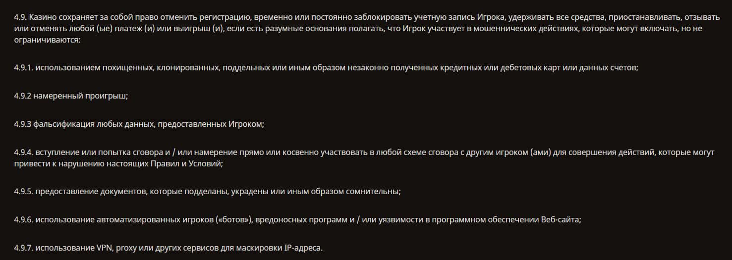 В пункте 4.9 казино Плэй Фортуна уведомляет, что оно заблокирует игрока, если выявит подозрительные действия с его стороны. В результате от этого пострадало множество игроков.