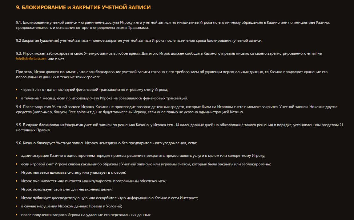 В пункте 9 своего договора казино Плэй Фортуна рассказывает, как можно заблокировать и закрыть свою учетную запись по желанию игрока.