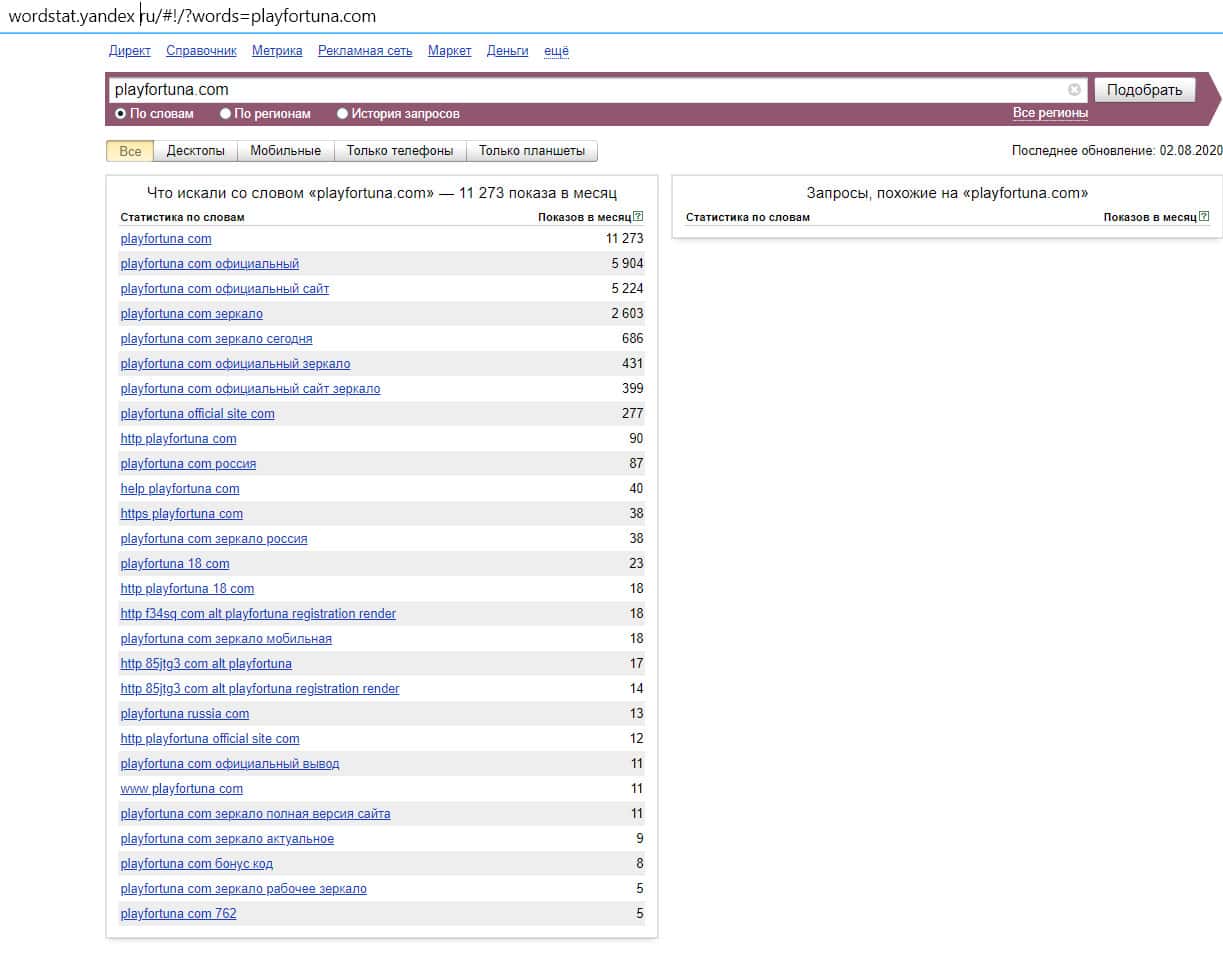 Количество запросов по домену "playfortuna.com" с точкой, совершенных в сервисе Яндекс, равняется 11 273 показам. Казино достаточно популярно у российских пользователей.