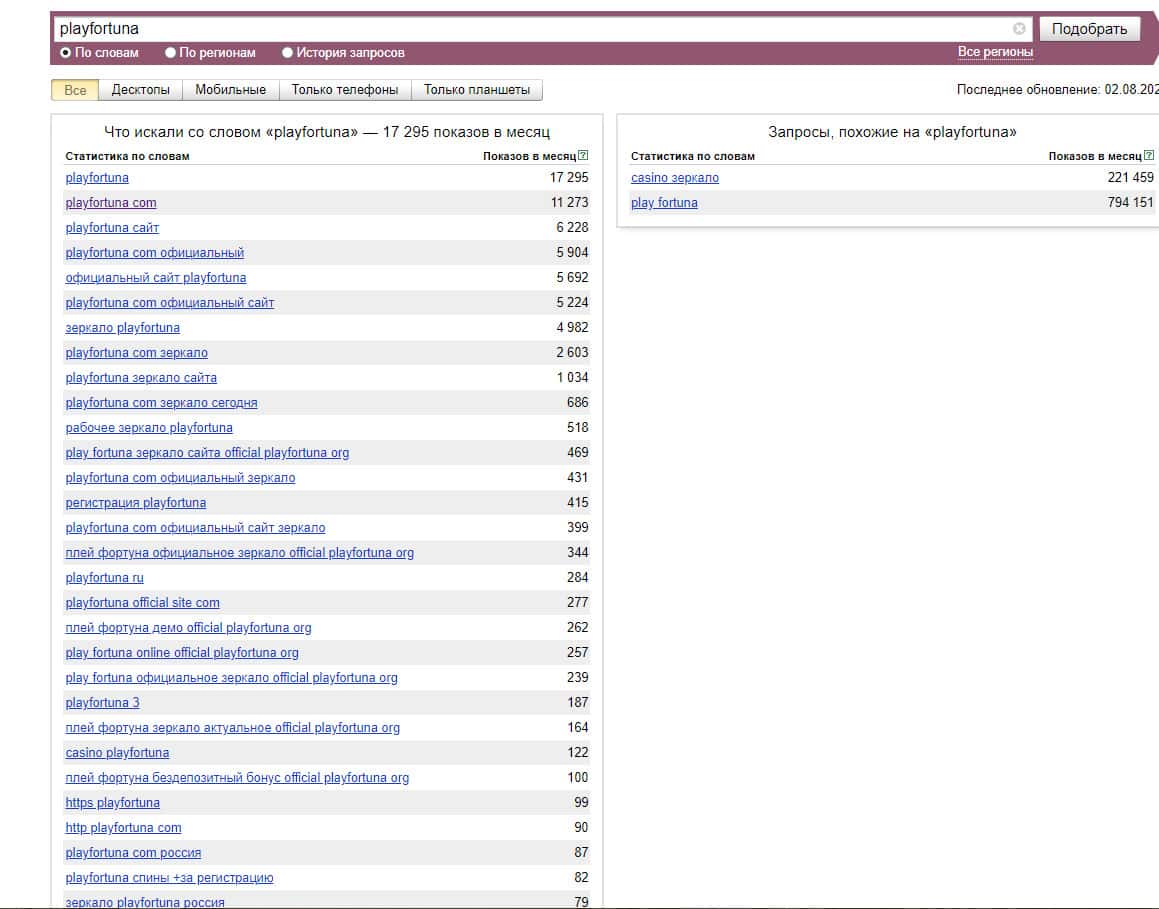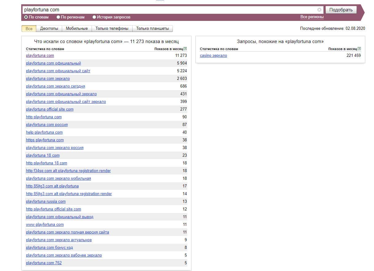 Название бренда "playfortuna" на английском языке пользователи искали в системе Яндекс немного большее количество раз: 17 295 показов за месяц.