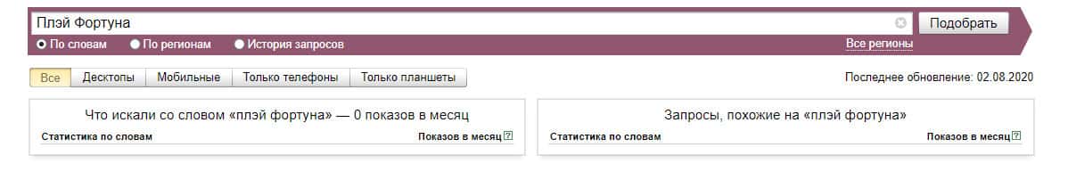 Название бренда "Плэй Фортуна" на русском языке люди совсем не искали в системе Яндекс, результат равен нулю.