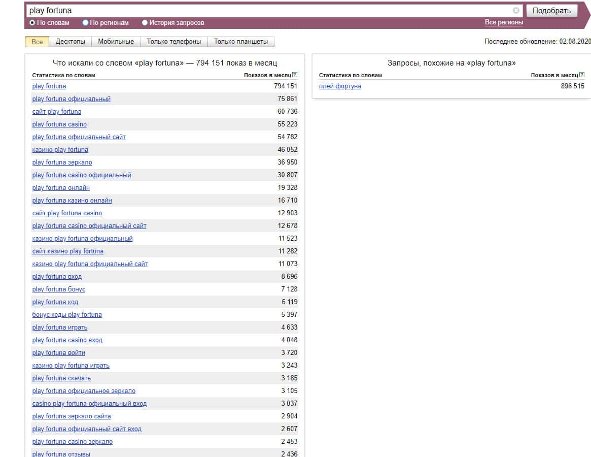 Количество запросов по бренду "play fortuna" на английском языке с пробелом довольно большое. Его набирали в поисковике Яндекс 794 151 раз - достаточно много.
