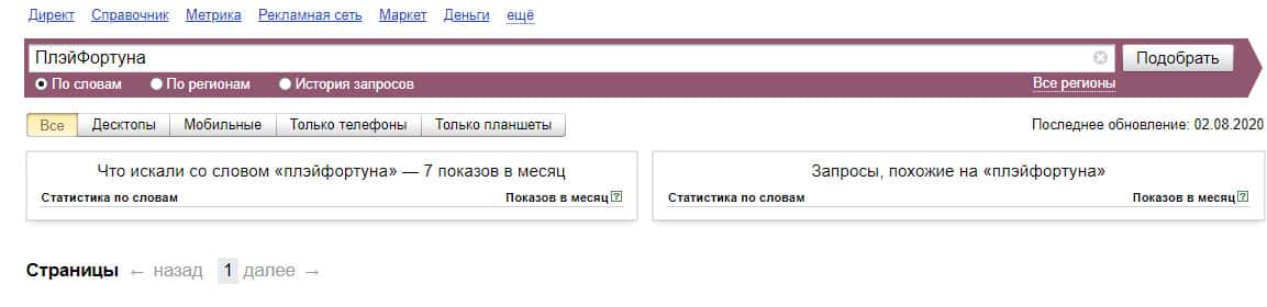 Название бренда "ПлэйФортуна" на русском языке без пробела пользователи почти не искали в системе Яндекс, результат равен 7 показам.