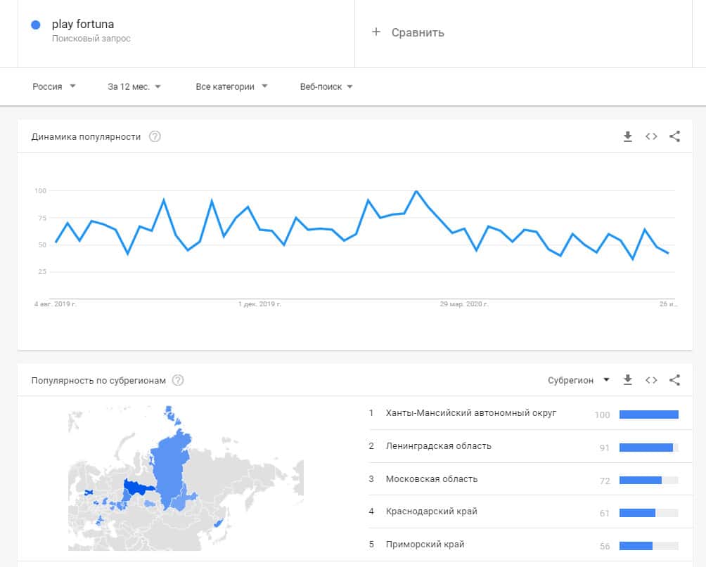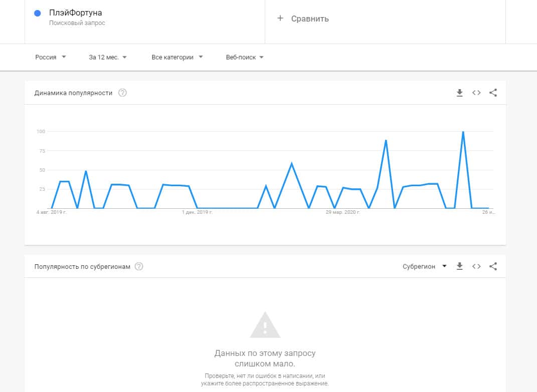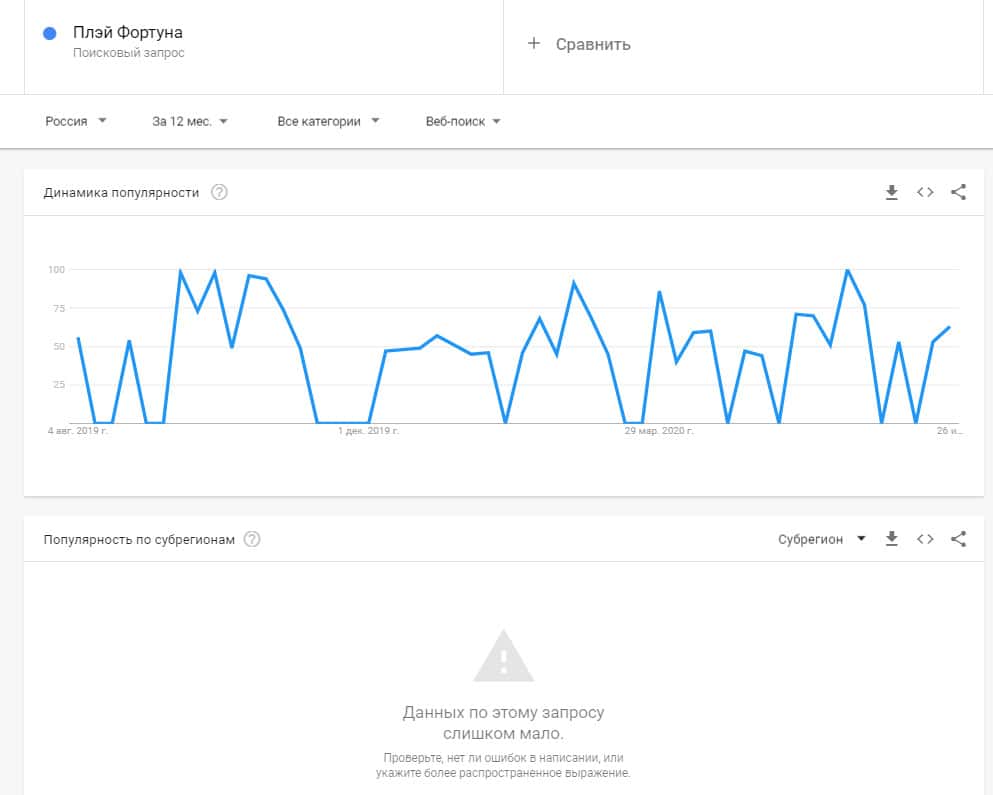 Название бренда "Плэй Фортуна" на русском языке искали в системе Гугл мало пользователей.