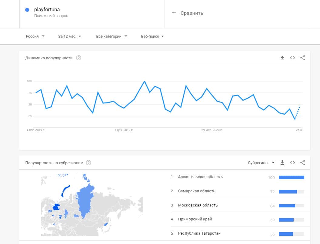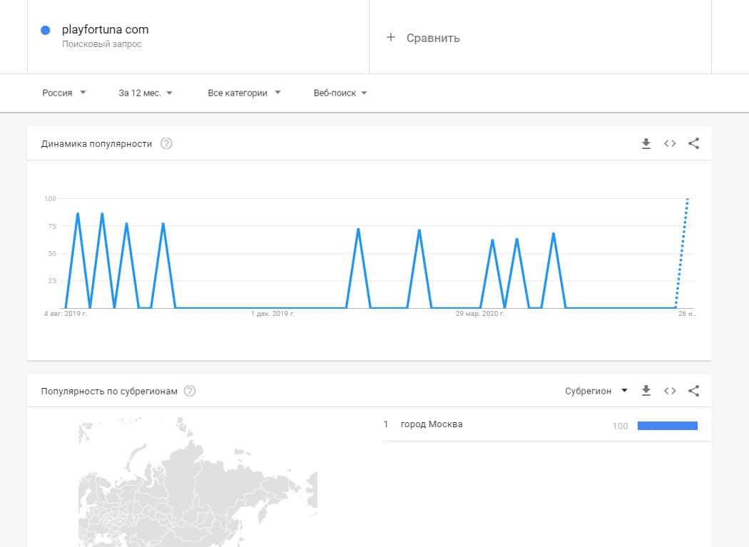 Запросы от пользователей по доменному имени "playfortuna com" в сервисе Гугл Тренд были в основном в московском регионе.