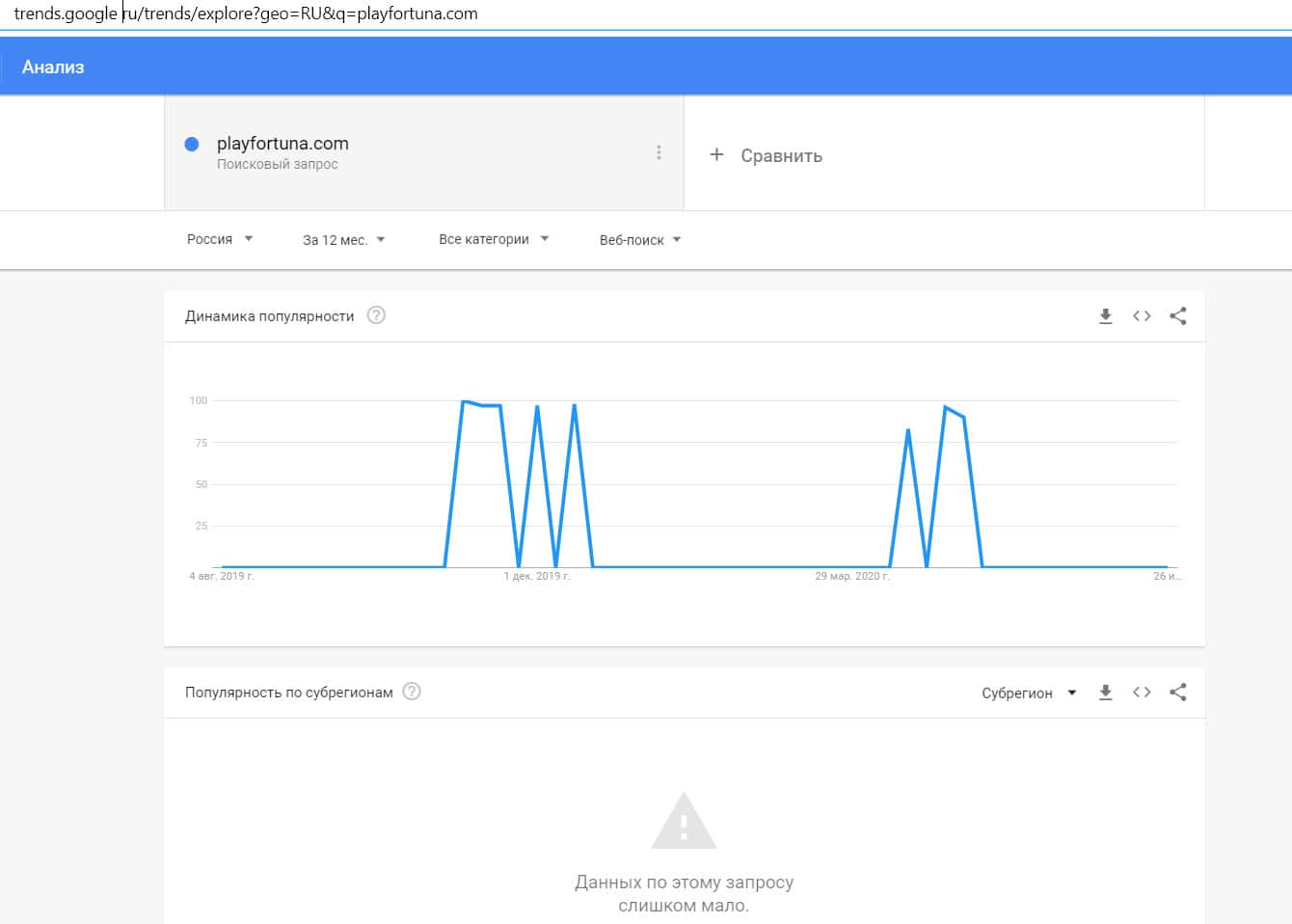 Судя по данным сервиса Гугл Тренд, доменное имя "playfortuna.com" с точкой пользователи искали не очень часто.