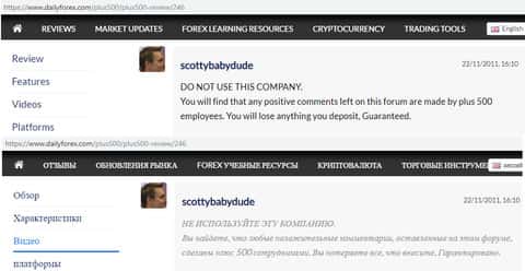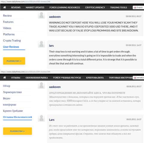 Еще пару случаев рассказало несколько бывших клиентов скам-конторы Плюс 500. В одном случае, клиент доверился и вложил 5 000 долларов, но когда он понял, что против него работает их же аналитик и способствует сливу депо, то решил вывести остатки. Но этого не случилось и из-за сбоя сайта все было утеряно. В следующем случае клиент расстался с конторой Plus 500 из-за того, что стоп-лосы не срабатывают, а когда приходит хороший момент для торговли, то система виснет и из-за этого появляются большие убытки.