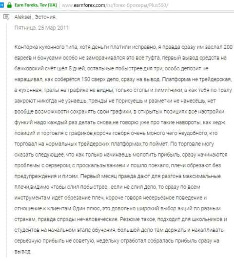 Анонимный пользователь интернета, который был клиентом конторы Плюс 500, рассказал несколько изъянов конторы. Первое это неадекватные котировки, которые расходятся с реальностью. Второе - это проскальзывание по цене в процессе открытия сделки. Третье, это то что, ночью если оставляете позицию, то урезают прибыль. А если вы хотите вывести прибыль, то они придумают множество отмазок, чтобы ничего не отдавать.