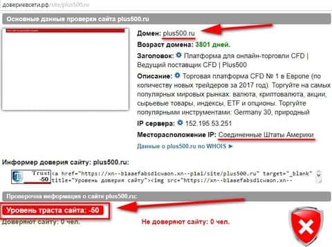 Согласно одному из интернет-ресурсу, который исследует сайты и выдает о них информацию, официальный сайт компании Плюс 500 под адресом plus500 ru не вызвал доверие у представителей интернет-сообщества. Ладно бы они были нейтральны к этой конторе, так они еще поставили негативную оценку по одной и той же причине: жульническая контора Plus500 обманывает людей и забирает у них деньги. Каждому пользователю интернета не было бы смысла без надобности очернять компанию, которая для них ничего плохого не сделала. Еще следует заметить, что айпи домена расположен в США, наверное скрывают, что-то если не захотели брать айпи сервера страны где расположена компания или хотя бы страны где они совершают свои преступления. Как говорится - у аферистов Плюс 500 рыльце в пушку!