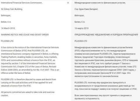 - Контора Plus500 получила предупреждение от International Financial Services Comission of Belize