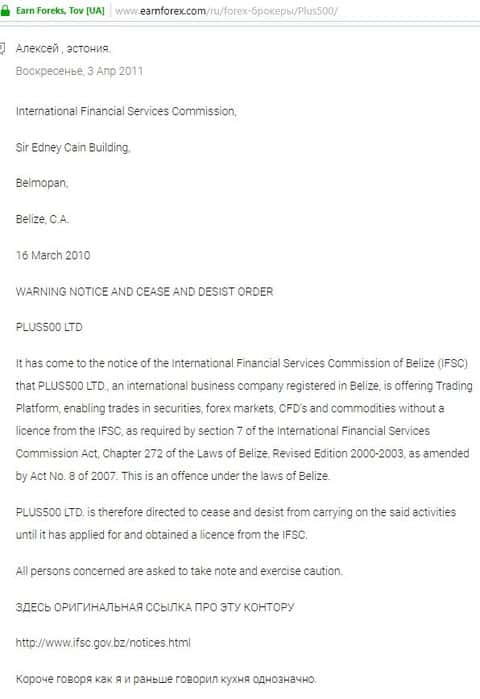 Благодаря одному из очень внимательных клиентов компании Плюс 500, мы узнали, что эта компания получала предупреждение от IFSC в 2010 году. Согласно ему компании Plus500 предписано прекратить и воздерживаться от продолжения указанных действий до тех пор, пока они не подадут заявку и не получат лицензию от IFSC. По каким-то причинам данное уведомление удалили из официального сайта регулятора Белиза и компания Plus500 так и не получило данное разрешение. Скорее всего руководство посодействовало, чтобы эта информация не просочилась в массы и тем самым порешала вопрос по-тихому. Вот так решают вопросы такие крупные международные кухни как Плюс 500 - куда там обычным брокерам, которые в пейнте рисуют себе разрешения!
