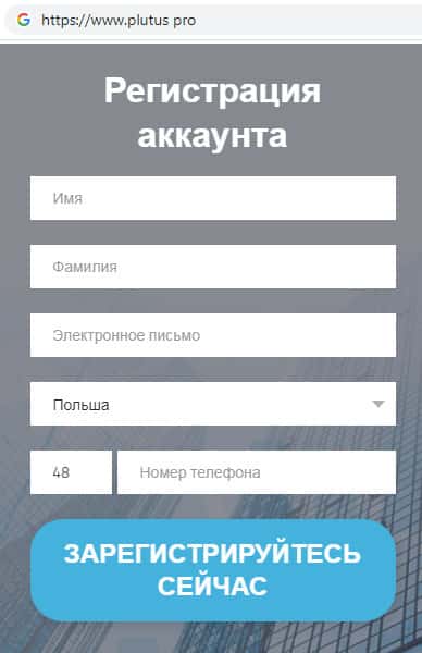 На интернет-портале шараги Плутас расположено два бланка для регистрации на их жульническом сайте, один из которых расположен в самом начале сайта, где необходимо указать имя, фамилию, адрес электронной почты, страну проживания, а так же номер контактного телефона.