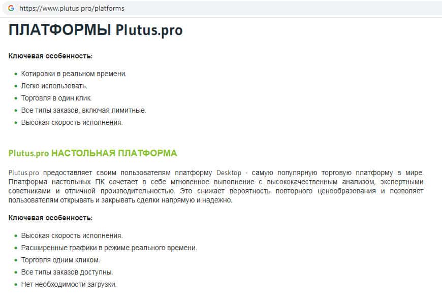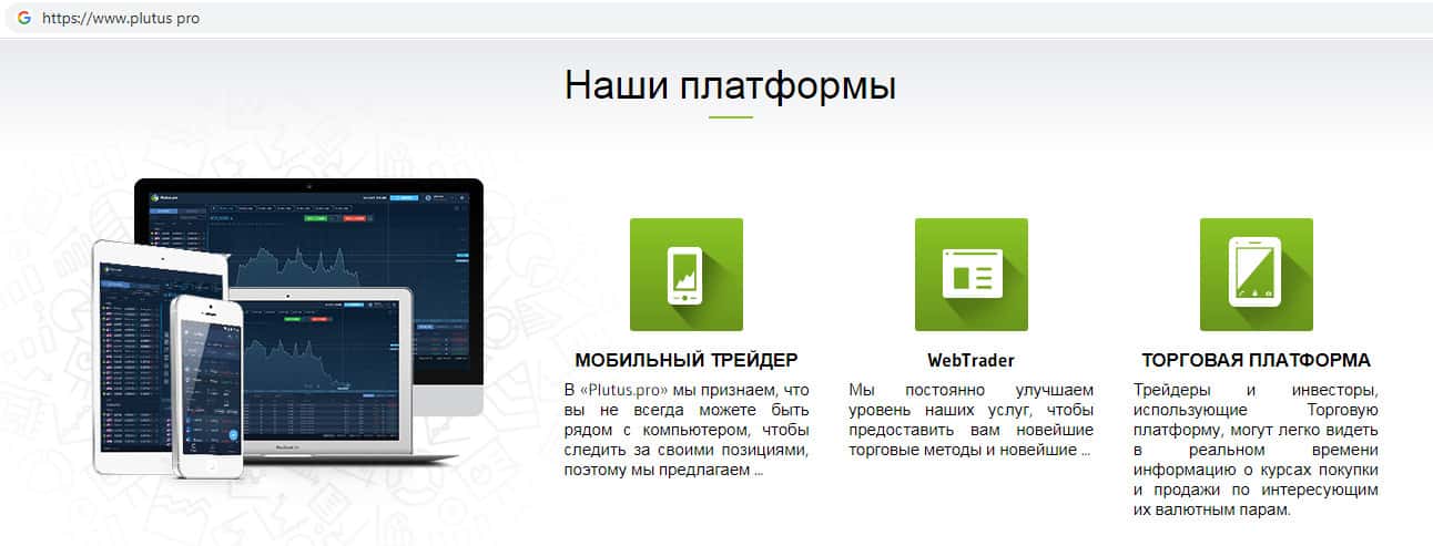 Шулера Плутас расхваливают свой сайт как можно больше предлагая пользователям начать торговать на их сайте. Здесь аферисты вешают людям лапшу на уши, что их торговая платформа понятная и удобная, что она разработана как для компьютеров так и для мобильных устройств. Это мошенники Plutus Pro называют удобством пользования платформой.