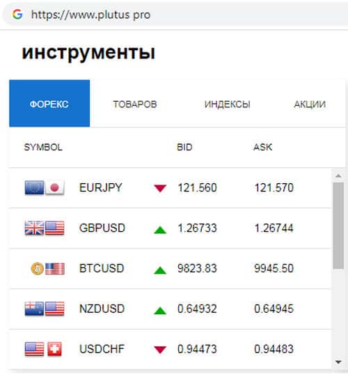 - Торговые инструменты на веб-сайте мошеннической организации Plutus Pro