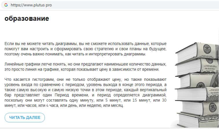 Здесь шулера Plutus Pro рассказывают сказки о том, что они якобы занимаются обучающей деятельностью, а именно обучением псевдо-науке, трейдингу. Единственное чему действительно можно обучиться на сайте скам-брокера Плутас - это больше не связываться с подобными мошенническими конторами.