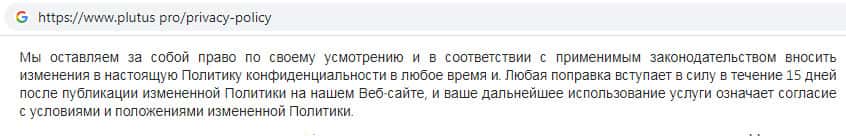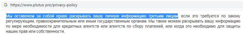 Политика конфиденциальности мошеннической организации Плутас