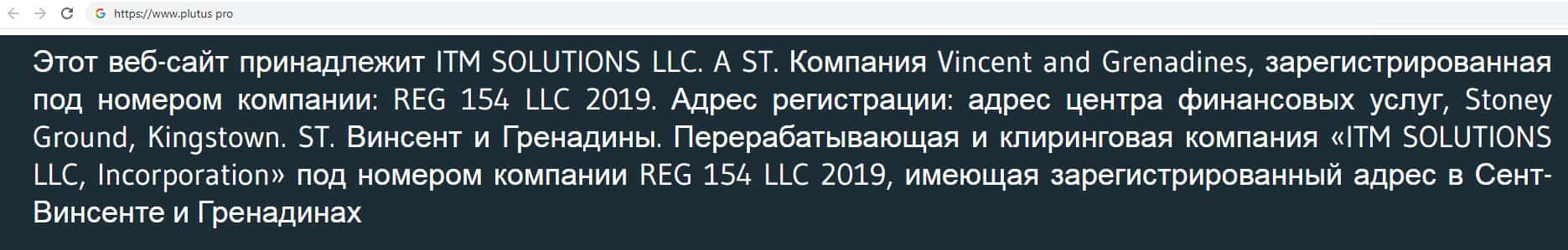 Данный интернет-лохотрон под названием Plutus Pro принадлежит юридическому лицу, находящемуся в одном из оффшоров на острове Сент-Винсент и Гренадины, где зарегистрировано немалое количество подобных организаций. Это не дает им право предоставлять свои брокерские услуги на территории Российской Федерации.