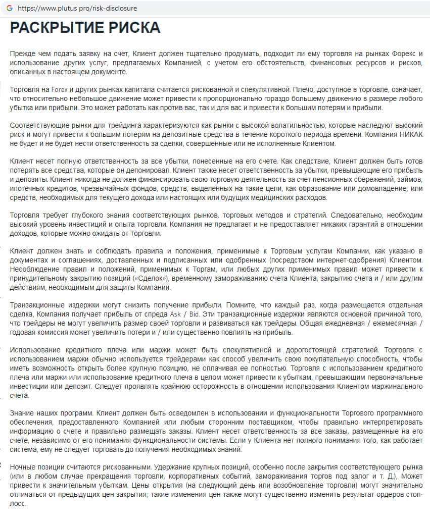 - Информация о всевозможных рисках на сайте скам-организации Плутас