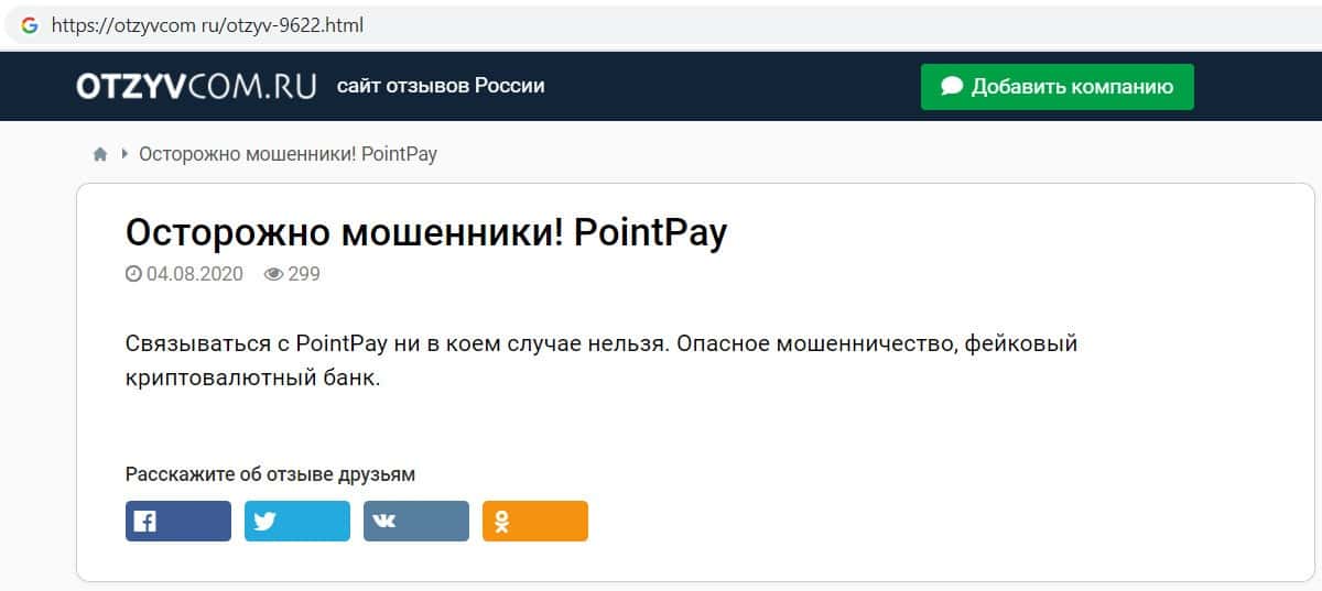 Так же своё слово о компании махинаторов PointPay высказал и сайт otzyvcom ru. Сайт посоветовал пользователям держаться как можно дальше от данных разводил.