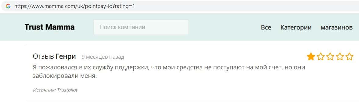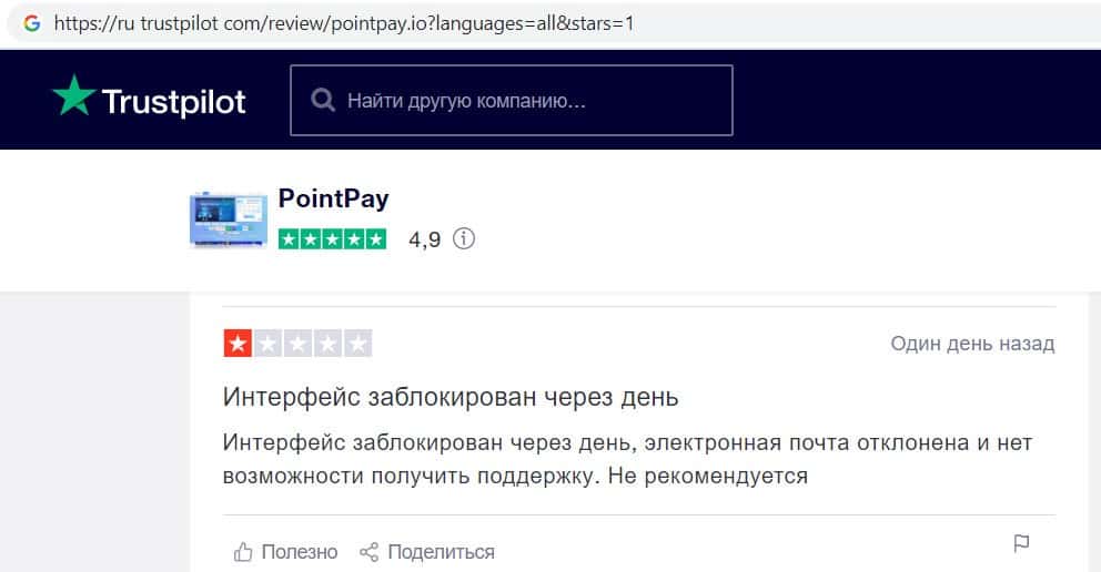 Перед вами отзыв пользователя о конторе Поинт Пэй на сайте ru trustpilot com, который написал, что компания его заблокировала через один день после регистрации.